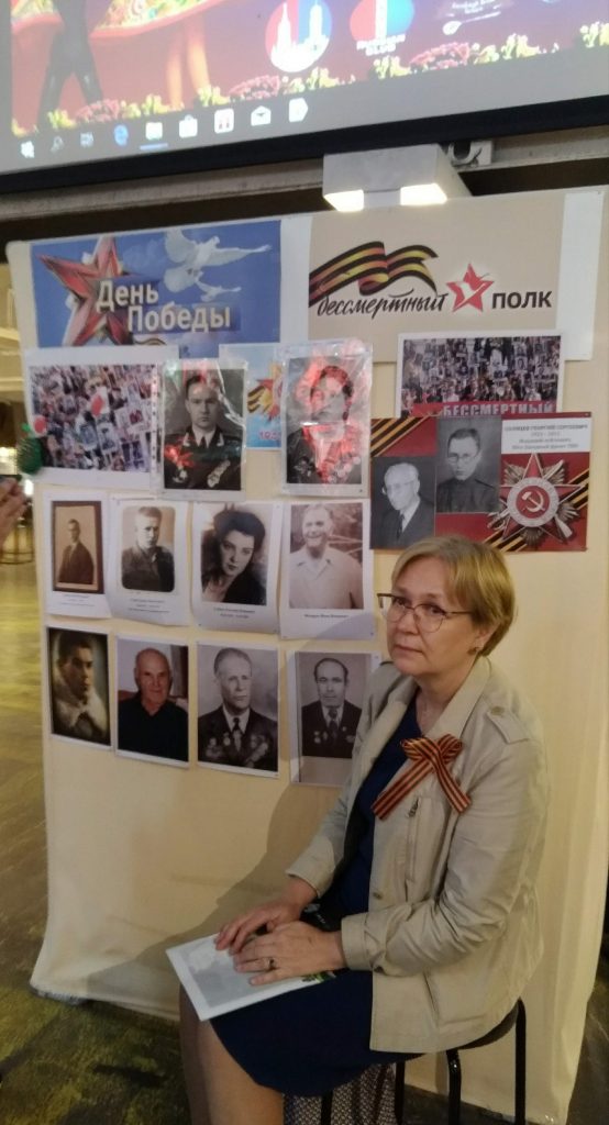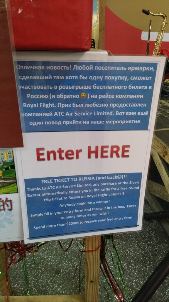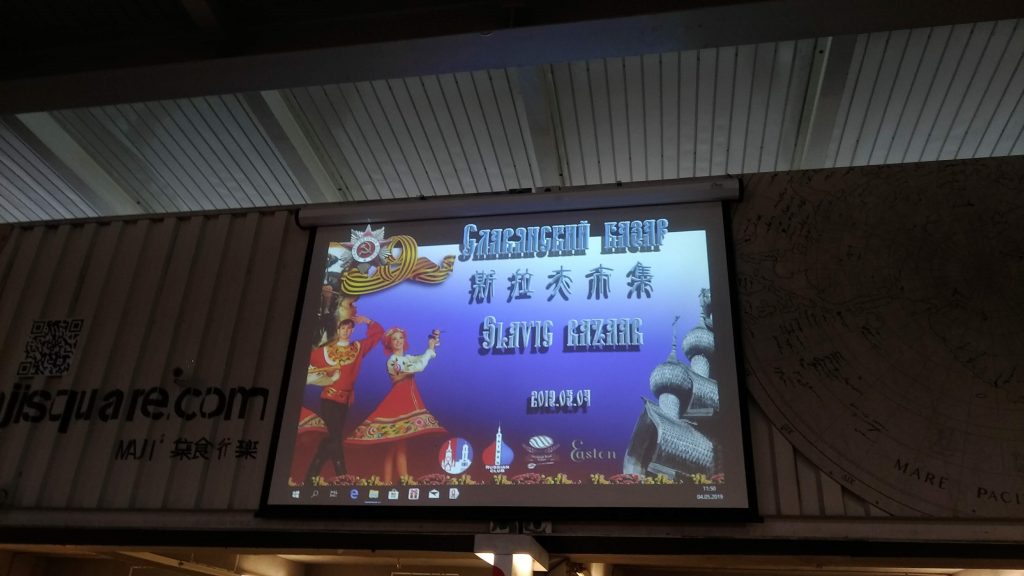在一堆小攤中,突然看到有位俄羅斯媽媽,她沒賣東西,但她的背後有著大看板。
