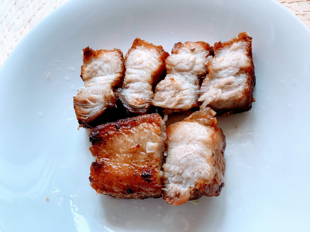 五花肉先燙過,再用氣炸機炸,逼出油。😋吃起來好香,好好吃~逼出的香香豬油還可以留著之後炒菜拌飯用呢。