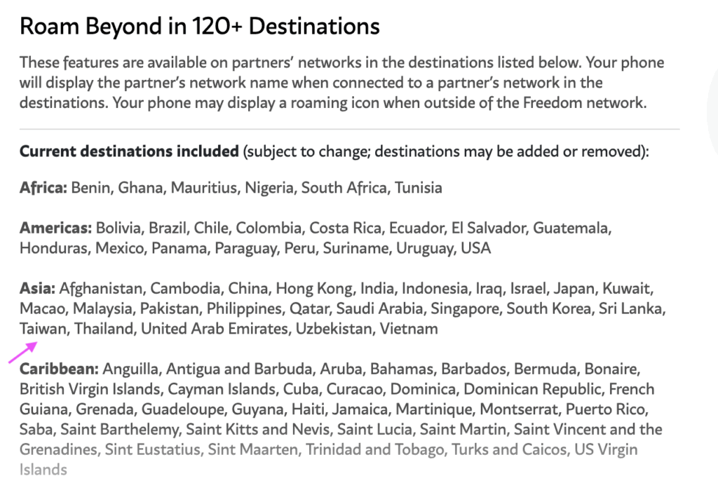 下面是 Freedom Mobile 可以漫遊的國家,不過列表太長,沒有合部放上,