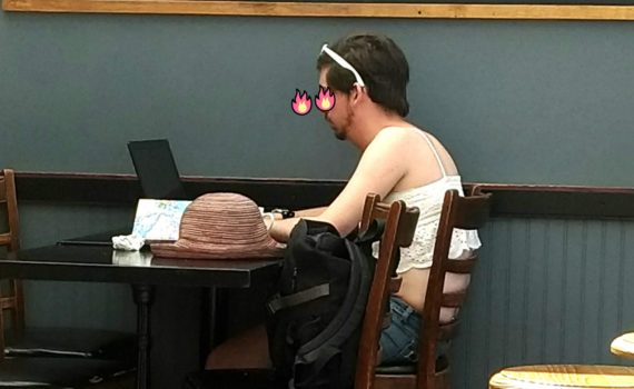 雖說今天的溫哥華有點熱,但先生你穿這白色蕾絲小背心會不會太Sexy ??? (看到一直在喬背心的位置,可能太緊) 下次麻煩褲子?還有鞋子?都要好好搭配溫柔風的?背心。 今天這個混搭風格有點不OK哦❌。扣50分,下次請改進?